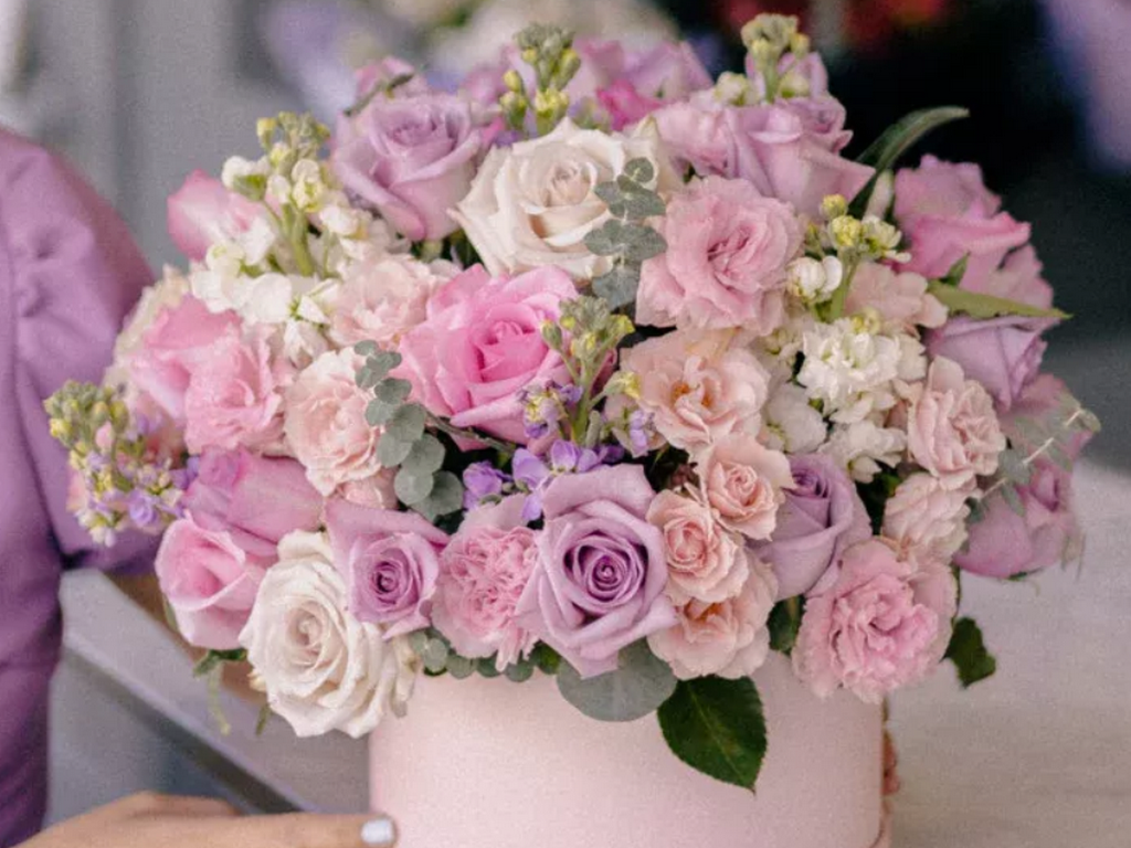 This serene composition mixes seashell-pink roses, white lilies, and blue accents to evoke a calm, coastal vibe. Hints of silver eucalyptus add movement and elegance. It’s a thoughtful choice for birthdays, thank-you gifts, or moments of reflection.